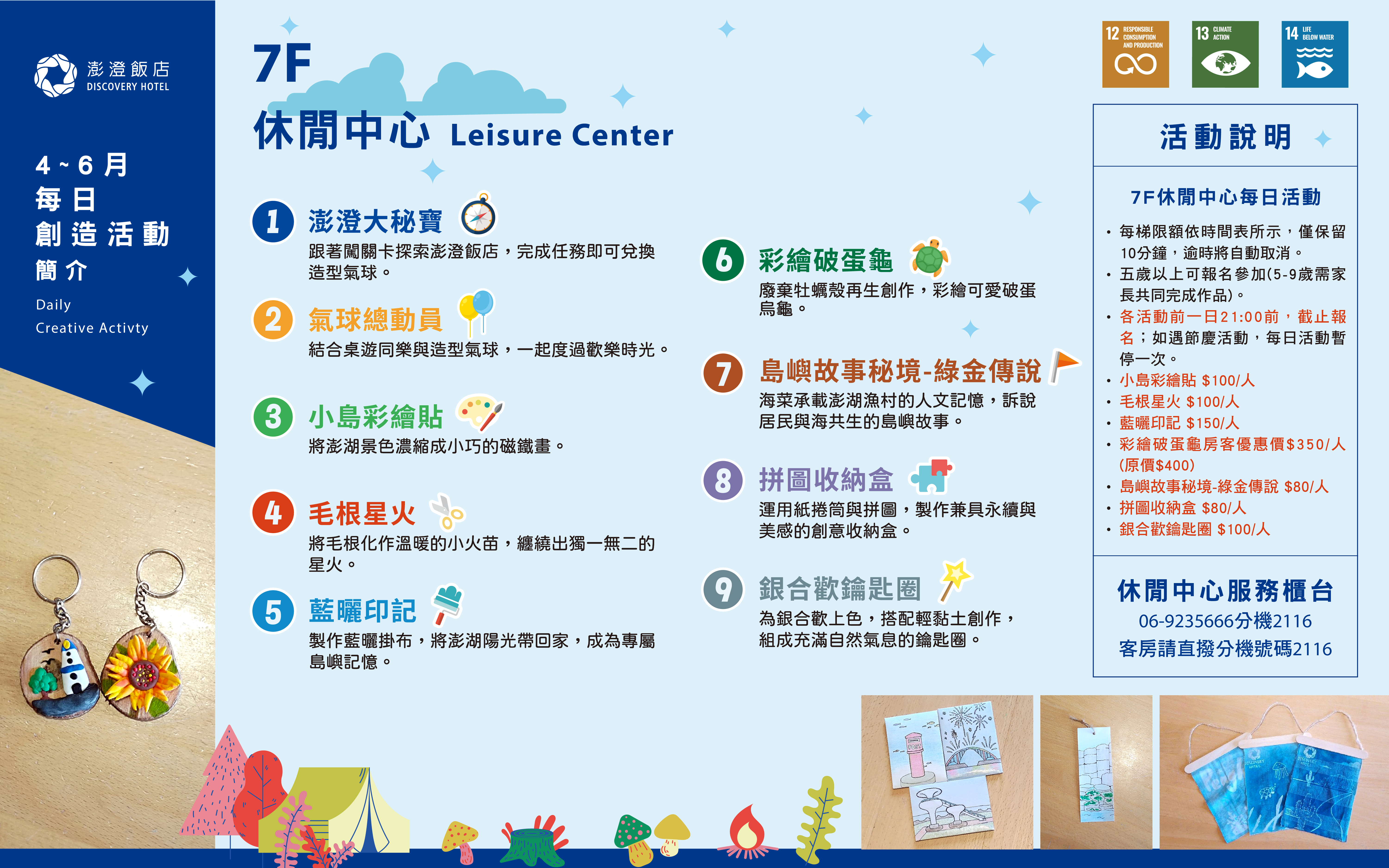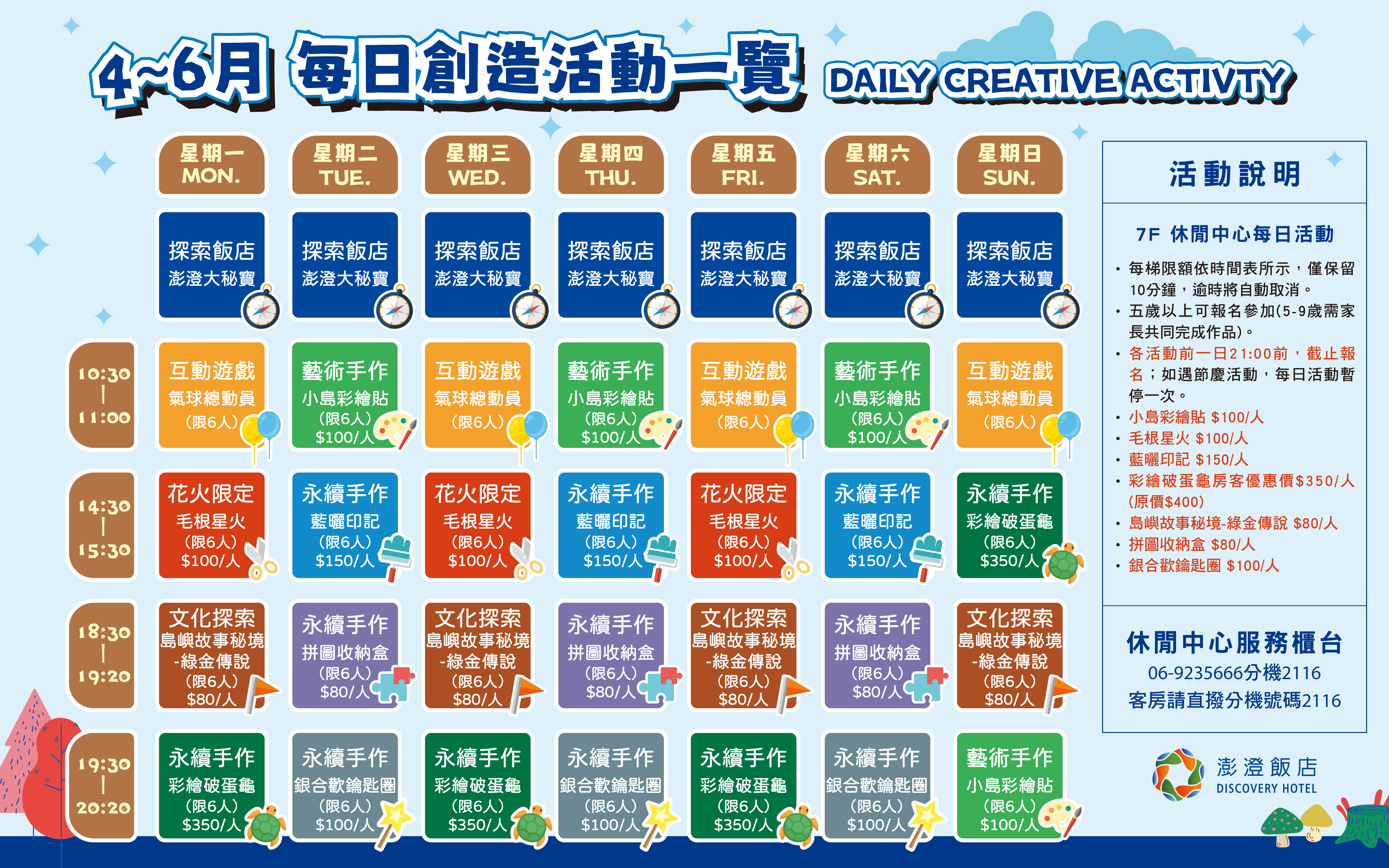 HOTEL NEWS Find The Message 線上客服 MESSENGER 澎澄飯店 Discovery Hotel SCROLL DOWN 04-06 月 Terrace Mi Casa 每日休閒活動表 2026.04.01 創意手作DIY,本季有許多動動小手發揮創意的活動,以及導覽體驗,等你來探索。 share Back to List NEXT NEXT 2026年度澎澄飯店行事曆 PARK GREEN SQUARE 2026年度澎澄飯店行事曆 2026.01.01 Fantasy journey 一起熱血澎湃,探索一場驚奇的奇幻旅澄