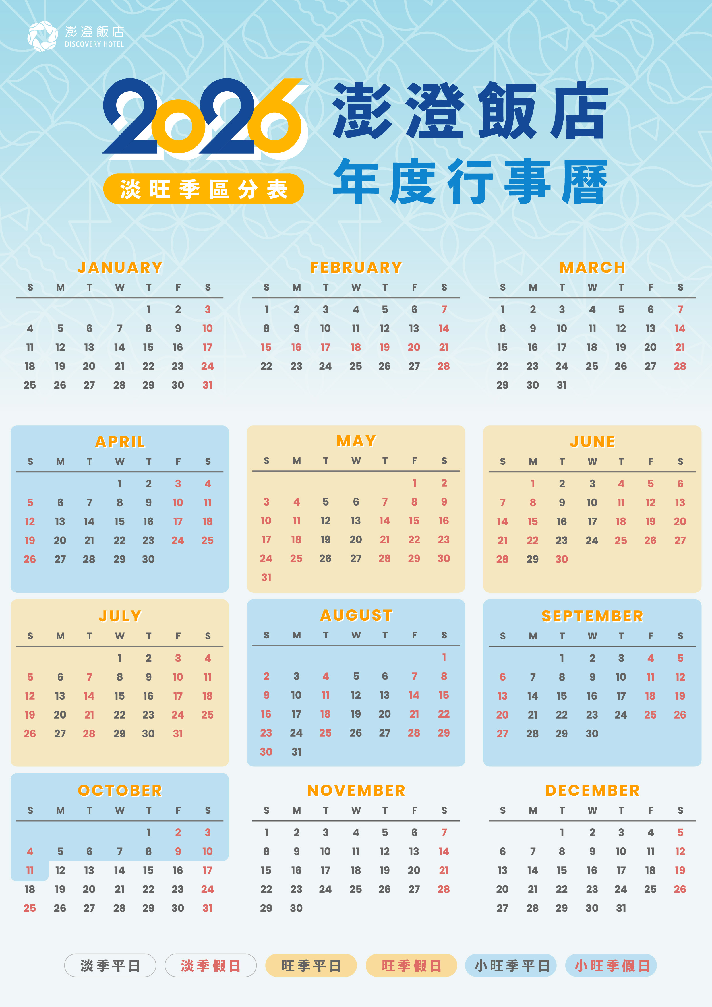 HOTEL NEWS Find The Message 線上客服 MESSENGER 澎澄飯店 Discovery Hotel SCROLL DOWN 2026年度澎澄飯店行事曆 2026.01.01 2026年澎澄飯店淡、旺季及平假日定義。 *澎澄飯店保留最終修改之權利,如有修改依此頁面公告為主,不另外公告 share Back to List Previous Previous 澄澄餐廳|金澄片皮鴨 超值套券! PARK GREEN SQUARE 澄澄餐廳|金澄片皮鴨 超值套券! 2025.12.15 NEXT NEXT 澎澄飯店八週年 | 刮出好運8 PARK GREEN SQUARE 澎澄飯店八週年 | 刮出好運8 2026.02.01 Fantasy journey 一起熱血澎湃,探索一場驚奇的奇幻旅澄