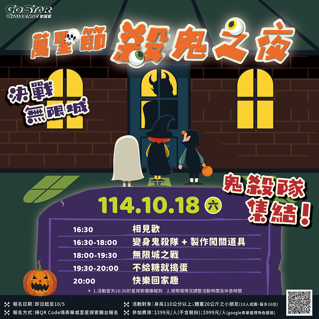 一年一度最瘋狂、最搞怪的萬聖節來啦! 快來參加我們的【萬聖節殺鬼之夜 - 決戰無限城】 一起變裝、闖關、拿糖果吧!